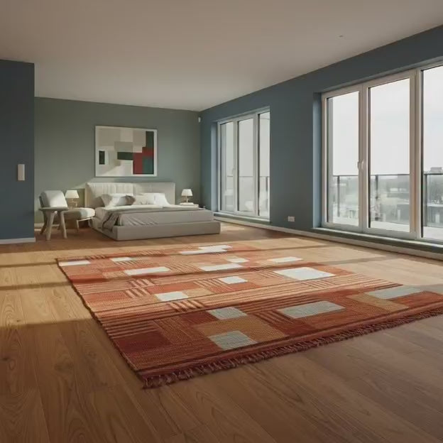 This burnt orange and beige handwoven striped rug brings cozy elegance to your home. Its wool blend construction delivers warmth, comfort, and natural beauty. Designed with a bold striped patchwork layout, the rug blends boho charm with minimalist symmetry. Cream and ivory tones add softness, while terracotta and camel create a warm base. Every fiber reflects the authenticity of a premium handwoven striped rug. Whether used in a living room, bedroom, or hallway, this piece adds personality and modern craft. With its soft texture and geometric precision, it stands out as a luxury striped handwoven rug.